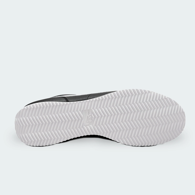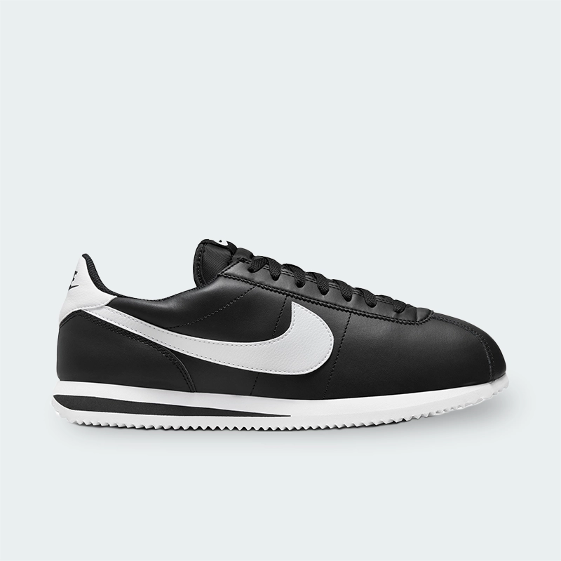 Clásico Cortez reimaginado en 2023 con parte superior de cuero negro y Swoosh blanco, puntera redonda y cierre con agujetas.